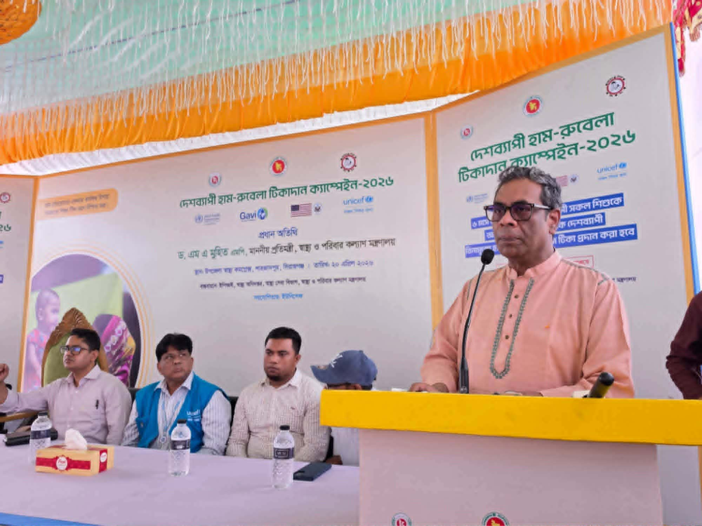 নিজ নির্বাচনী এলাকা সিরাজগঞ্জের শাহজাদপুর থেকে দেশব্যাপী হামের টিকাদান কর্মসূচির আনুষ্ঠানিক উদ্বোধন করেছেন স্বাস্থ্য প্রতিমন্ত্রী ড. এম এ মুহিত। সোমবার (২০ এপ্রিল) সকালে শাহজাদপুর উপজেলা স্বাস্থ্য কমপ্লেক্সে আয়োজিত অনুষ্ঠানে তিনি এই কর্মসূচির উদ্বোধন করেন।
